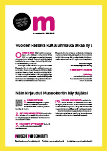 | | Museokortti on myös kulttuurin ystävän etukortti. Valikoiduilta kumppaneiltamme saat Museokortti-etuja ja -lisäpalveluja keltaisen korttisi näyttämällä. |