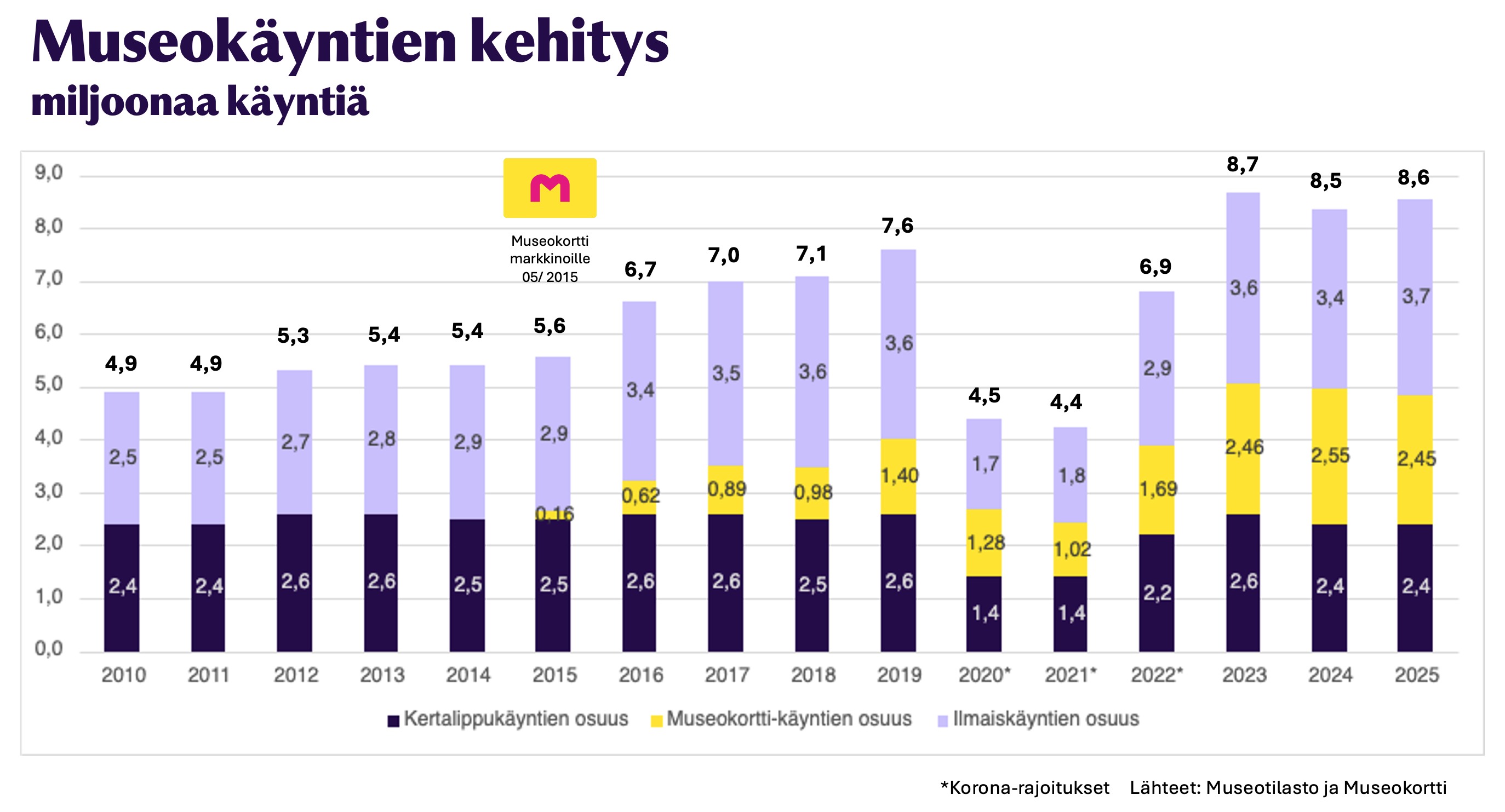 Museokortin käyttöönoton jälkeen museot ovat rikkoneet kävijäennätyksensä kuutena peräkkäisenä vuotena. Kävijämääriin vaikuttivat vuosina 2020–2021 koronarajoitukset, joiden poistuessa alkuvuodesta 2022 museokäynnit kääntyivät jälleen nousuun. Myös kotimaanmatkailun suosio näkyy kävijämäärissä. Kesän lomakuukaudet muodostuvat vuosi vuodelta merkittävämmäksi museosesongiksi. Kasvaneet kävijämäärät tarkoittavat myös kasvaneita oheispalvelutuloja museoille,kun useampi museokävijä käyttää muita palveluja, kuten museokahviloita ja -ravintoloita, museokauppoja ja museoiden tapahtumia.