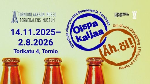 Tervetuloa kuulemaan asiaa oluesta ja oluenpanosta Tornionlaakson museon opastetuille kierroksille Oispa kaljaa -näyttelyyn! Kierroksella tutustutaan oluen historiaan sen synnystä aina nykypäivään saakka ja pohditaan sen merkitystä yhteiskunnallisella tasolla. Kierroksella kerrotaan muun muassa oluen valmistuksen vaiheista ja siihen vaikuttavista tekijöistä. Lisäksi perehdytään oluen rooliin ihmisten arjessa, juhlassa ja uskomuksissa.