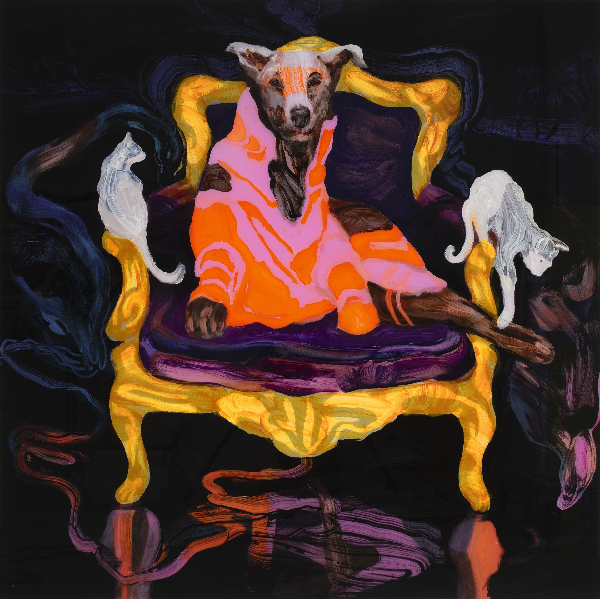 Elina Ruohonen maalaa käänteisellä tekniikalla läpinäkyvän pleksin takapinnalle, jolloin etupuolen kiiltävä pinta heijastaa sekä tilan että katsojan osaksi teosta. Teoksissa tarkastellaan elollisten olioiden muotoja ja fuusioitumista sekä tulevaa mahdollista aikaa, jolloin eliölajien voimasuhteet ovat muuttuneet. Ihmisen ja luonnon välinen jakolinja hämärtyy, ja uudessa maailmassa elävät yhdessä selviytyjät.