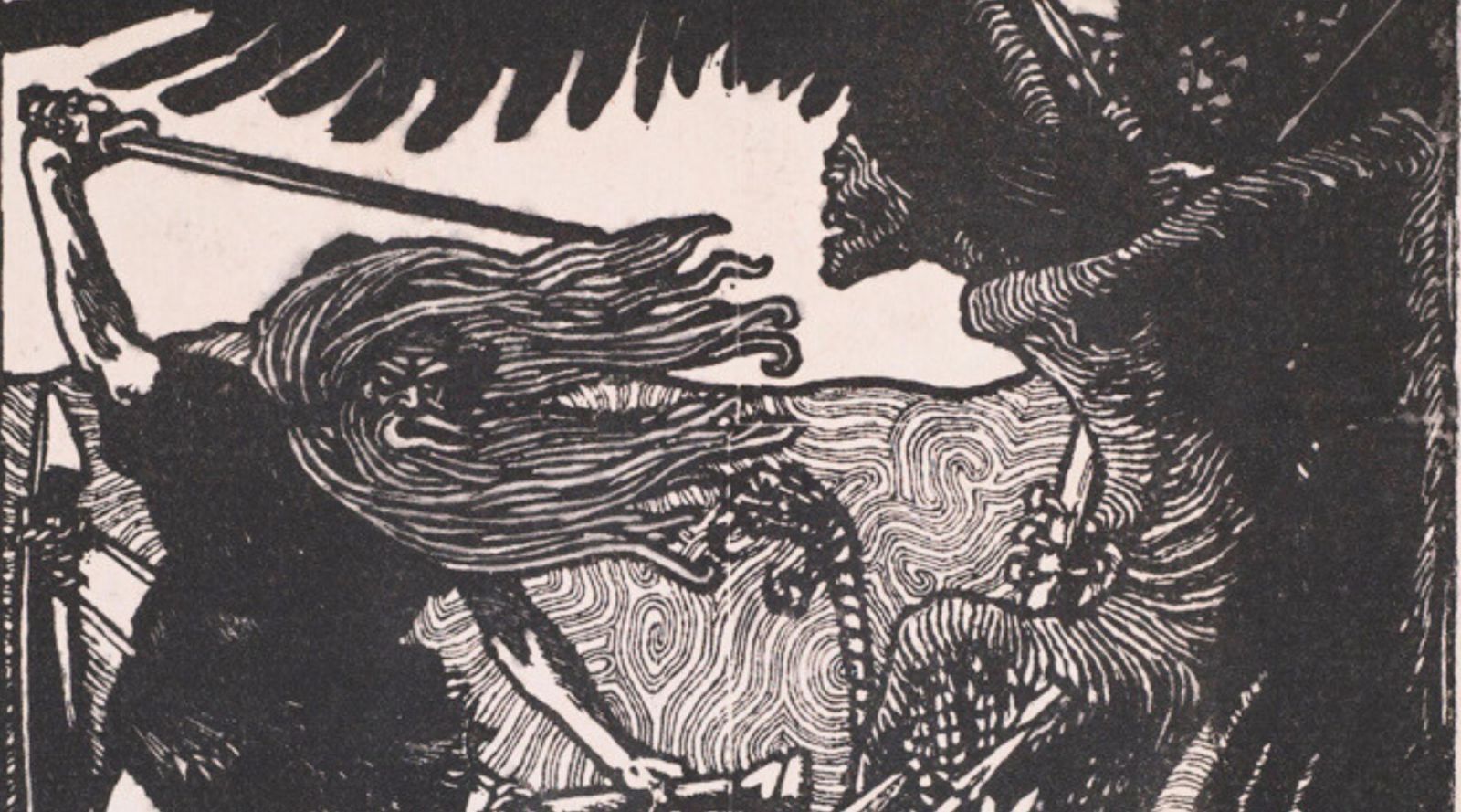 Yksityiskohta Sammon puolustus -puupiirroksesta.