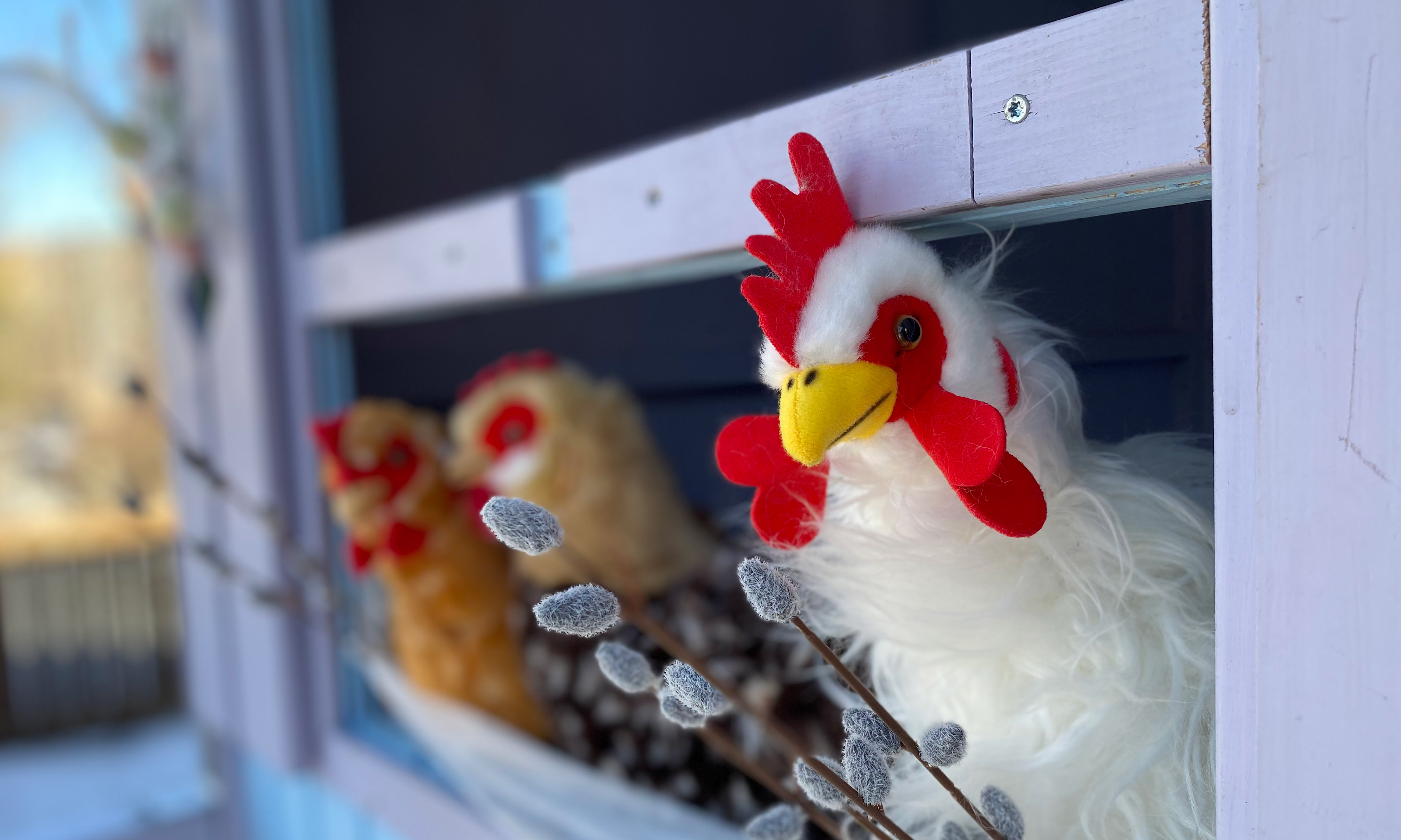 Keskustelupuiston leikkimökin ikkunasta pääsee kurkistamaan pehmolelujen pääsiäisen viettoa. Kanalassa asuu komea kukko kanoineen ja suloisine tipuineen. Niiden seuraan on liittynyt myös pari pupua. Kanalan pehmot ovat oikean kokoisia ja mainion näköisiä eläinleluja. Kanalan pääsiäiskoristelu sisältää runsaasti yksityiskohtia.
