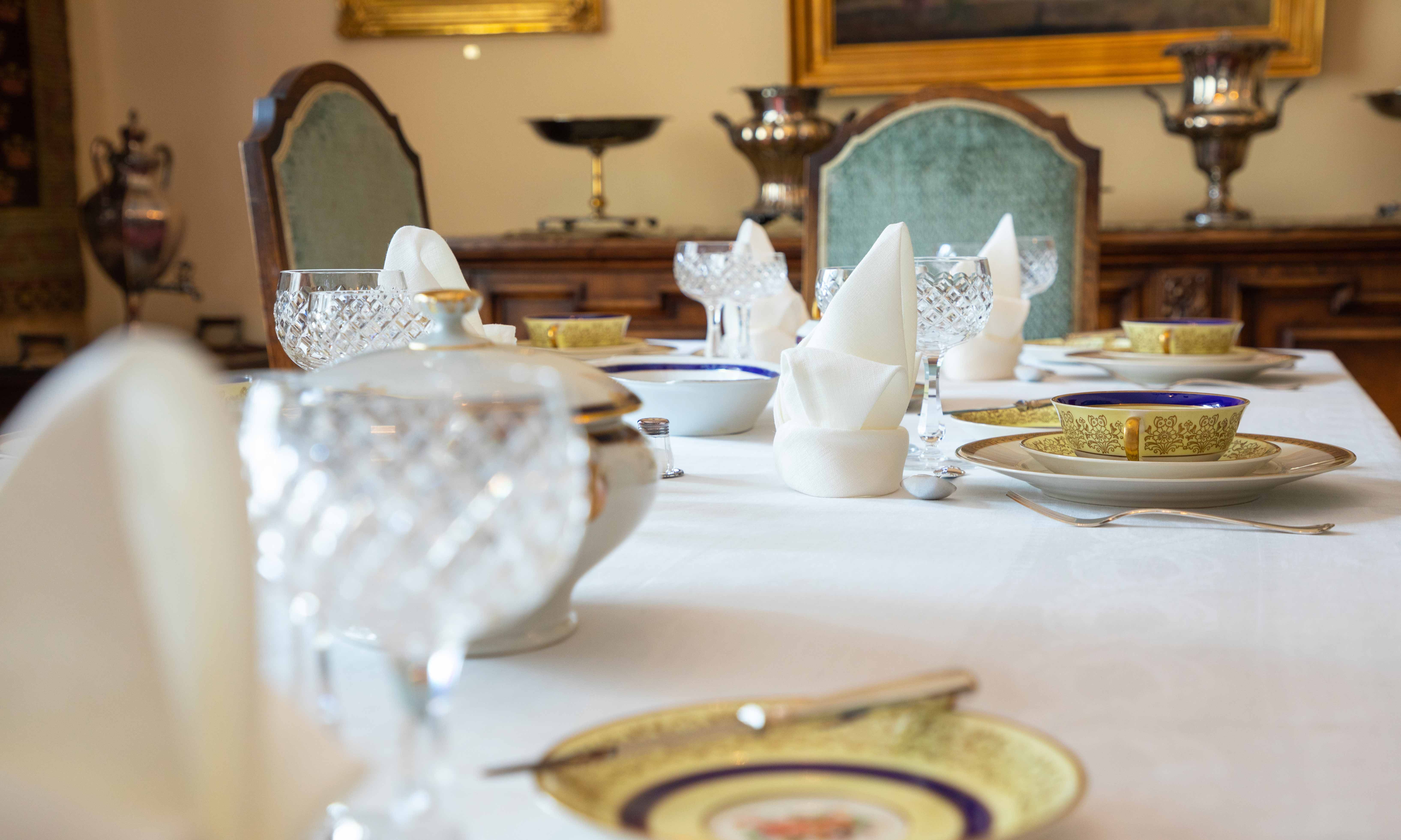 Teresia ja Rafael Lönnströmin kotimuseon ruokasaliin on katettu pääsiäiseksi hienoimmat posliinit, kristallilasit ja hopeat. Teollisuusneuvos Teresia Lönnström oli kauniiden kattausten ja hyvän ruuan ystävä. Kotimuseon juhlapöytä on katettu Teresian alkuperäisillä astiastoilla.