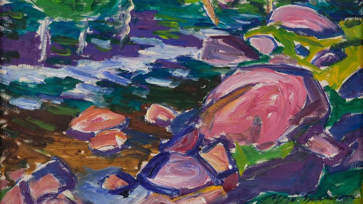Näyttelyssä on esillä teoksia Jyväskylän kaupungin taidekokoelmista, kuvassa yksityiskohta Yrjö Saarisen öljymaalauksesta Tourujoki vuodelta 1945.