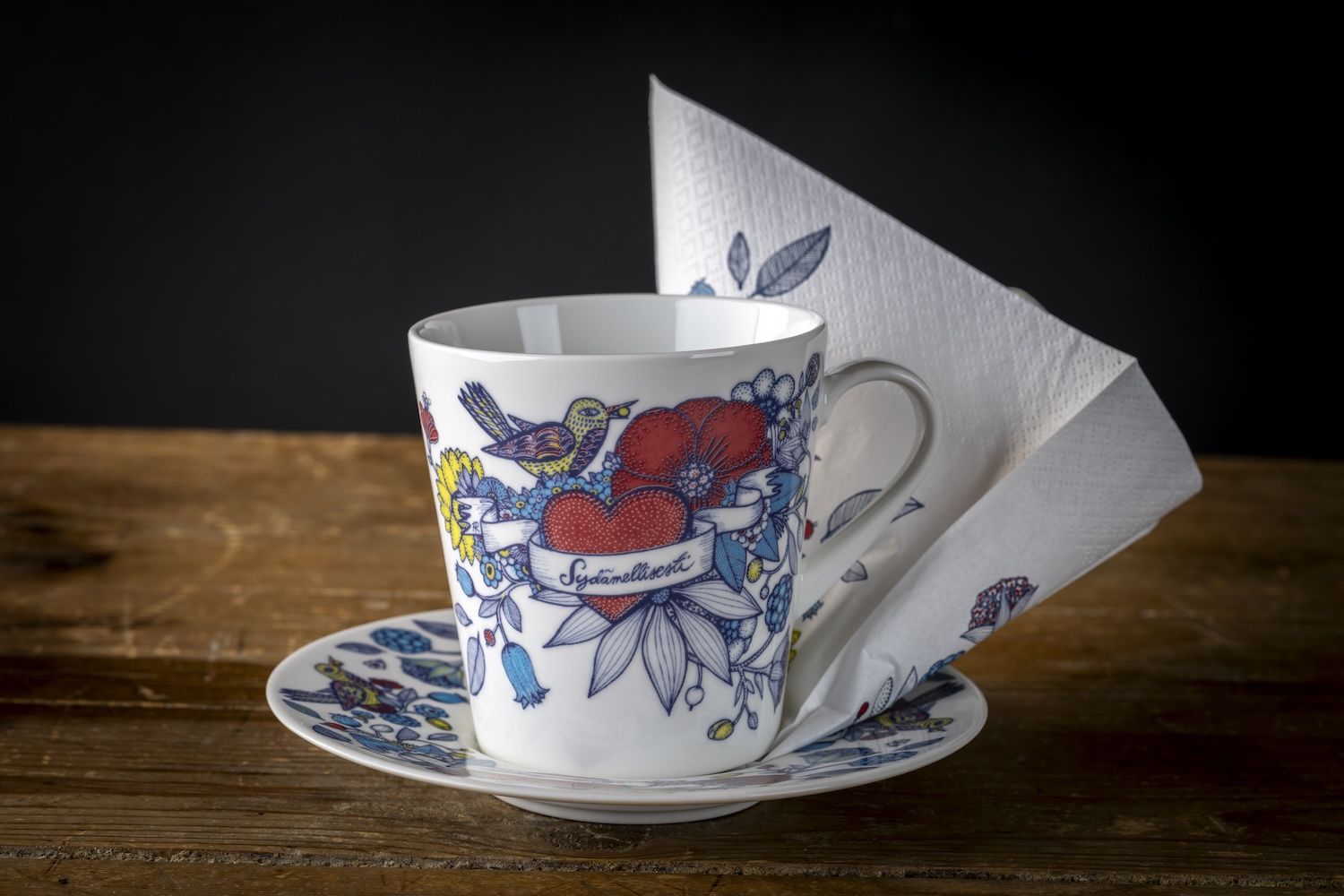 Kauniiseen settiin kuuluu Sydämellisesti muki, 16 cm aluslautanen sekä Sydämellisesti-servetit (20 kpl/pkt, kooltaan 33 x 33 cm).