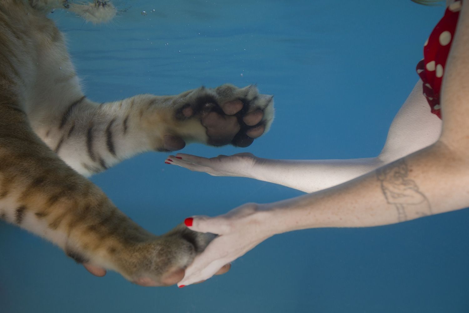 Kuvan teoksessa (un)common intimacy (2018) taiteilija Jessica Segall ui yhdessä yksityisreservaattien villieläinten kanssa. Kuva: Ruben van Vliet