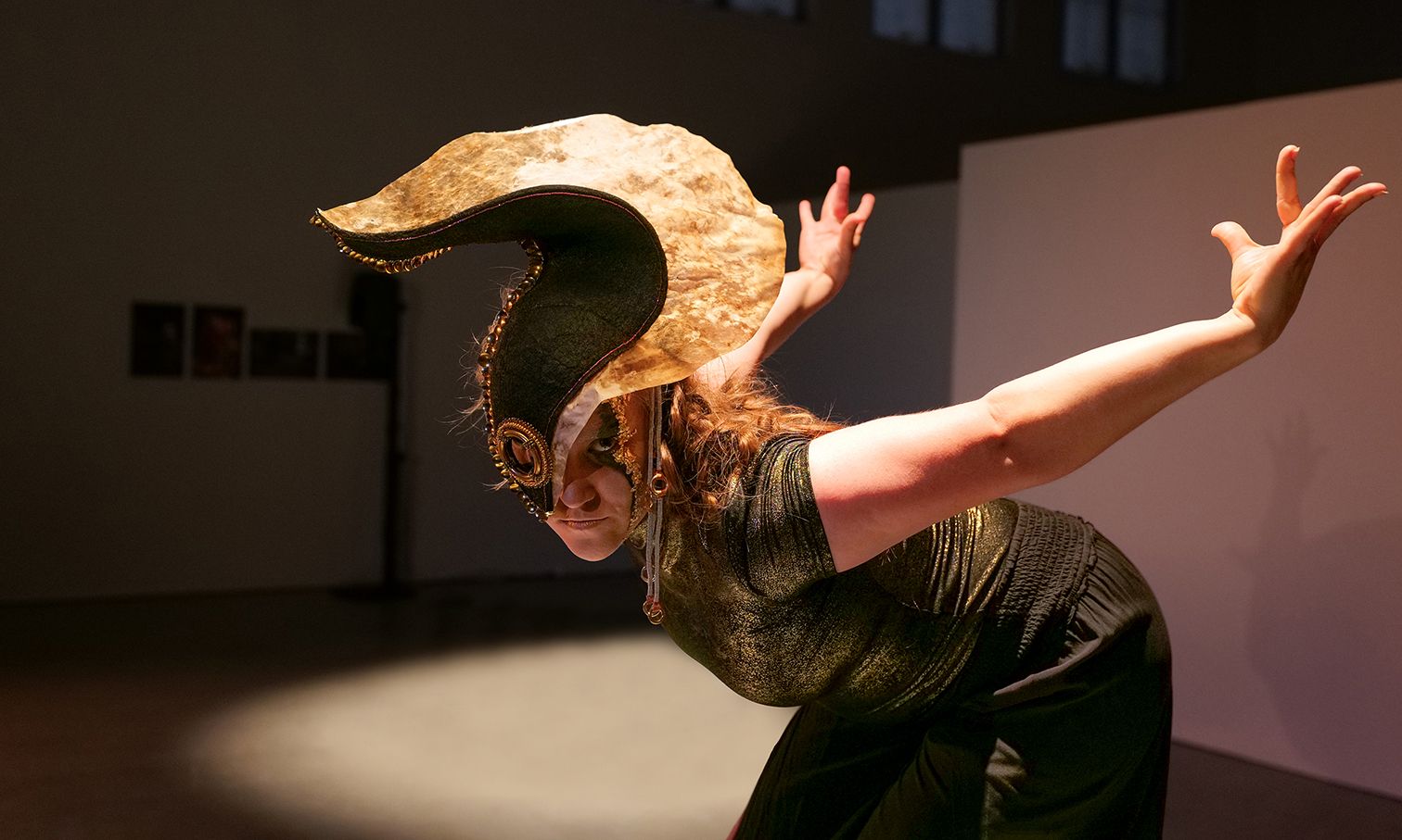 Näyttelyssä on esimerkiksi Ann-Sofie Kallokin teos Guoddi (2025), jossa tanssii Ánna-Katri Helander. Kuva: Albinas Liutkus