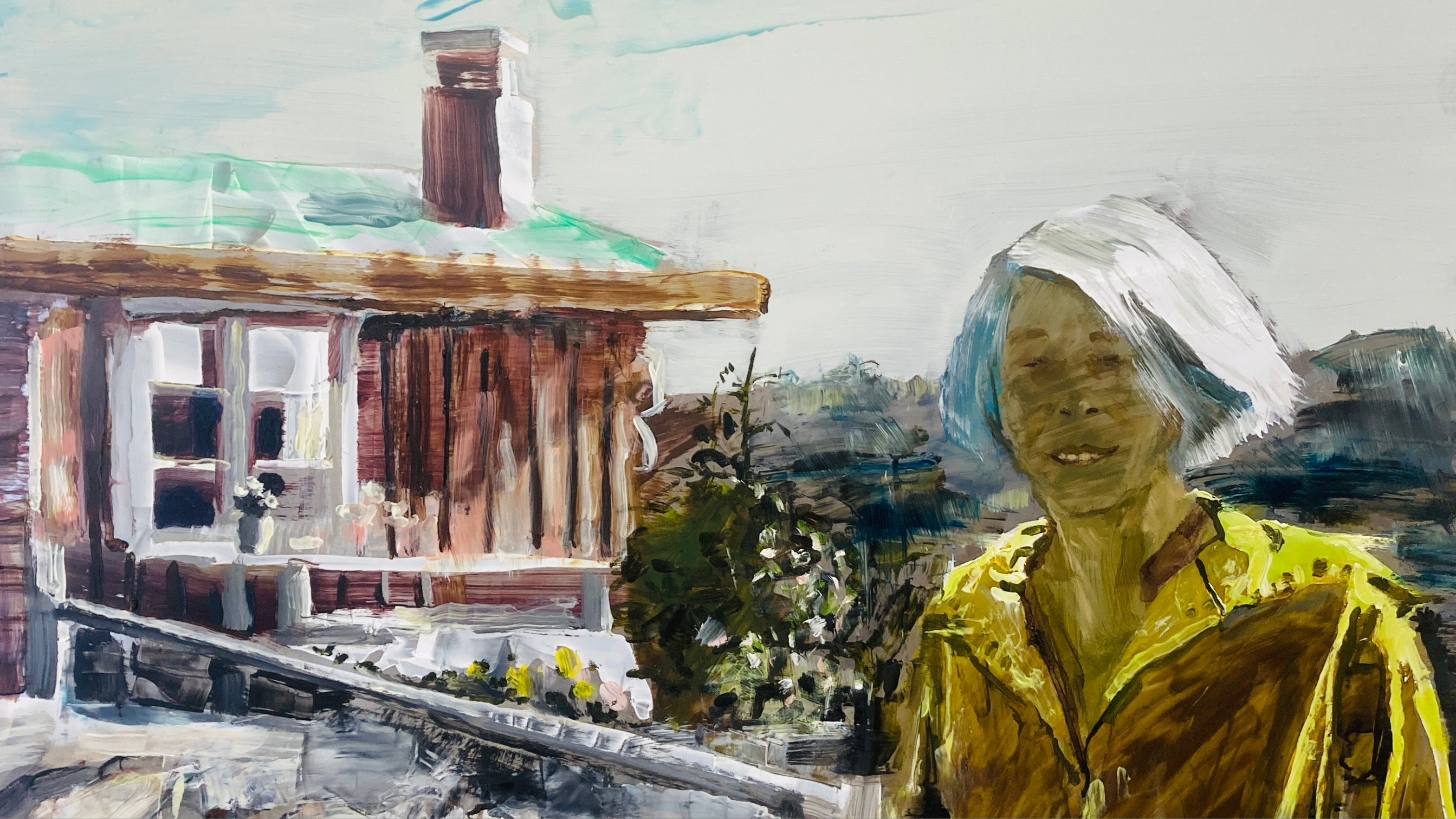 Taiteilija Erika Adamssonille tärkeää on Klovharun mökin interiöörin ja elettyjen elämien välinen dialogi. Kuvassa Adamssonin teos Vihreä anorakki. Kuva: Chappe