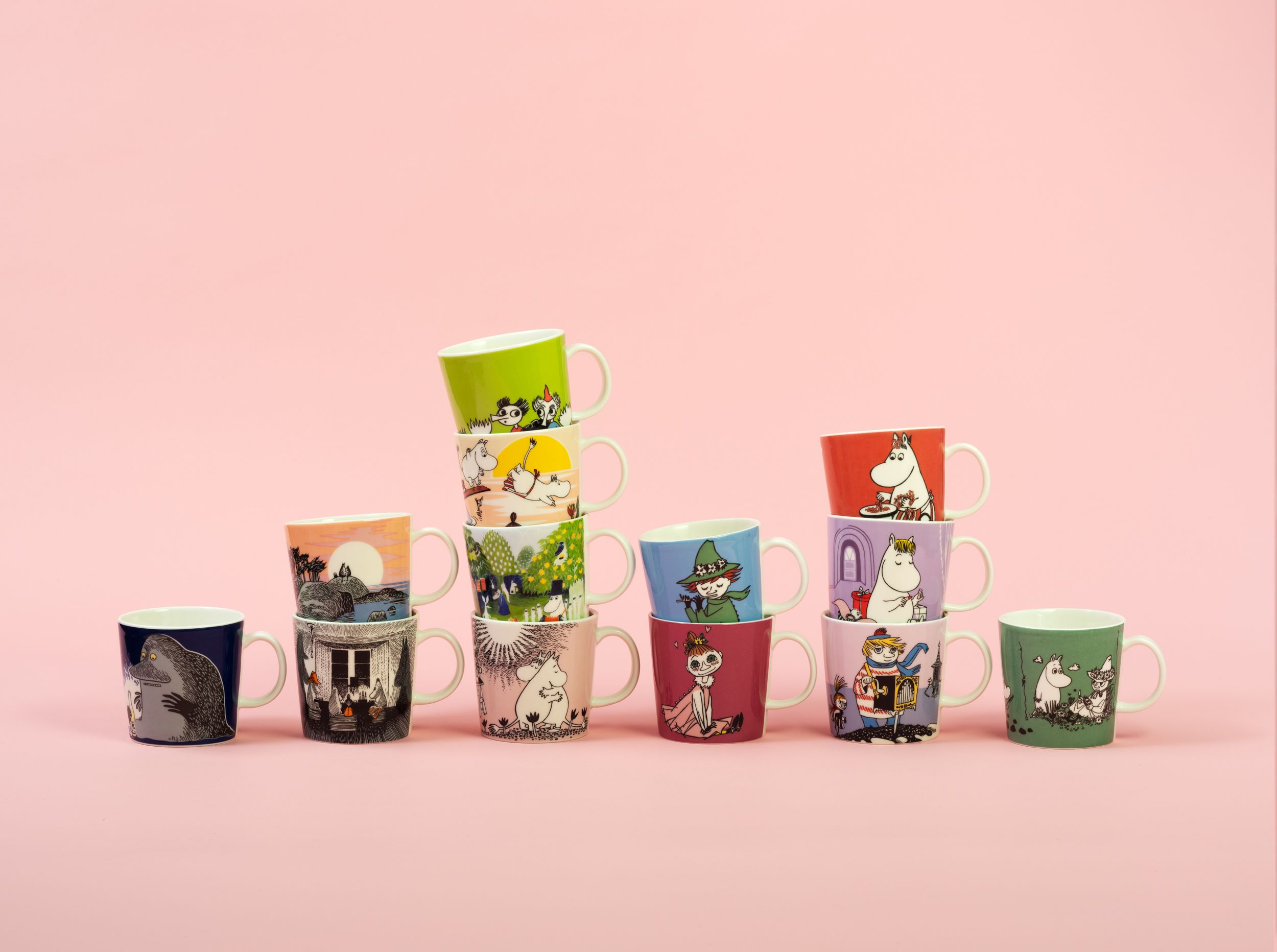 Muumimukit edustavat myös suomalaisuutta. Mukit ovat käytössä monilla arjessa, mutta ne ovat myös kallisarvoisia keräilykohteita. Kuva: Muumimuseo