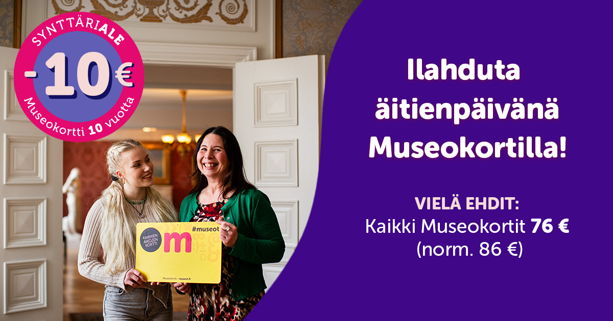 Museokortti täyttää 10 vuotta! Osta Museokortti itselle tai lahjaksi juhlahintaan ja avaa ovi satoihin elämyksiin. Museokortti on loistava lahjaidea äitienpäivään, valmistujaisiin sekä muihin kevään ja kesän juhliin.