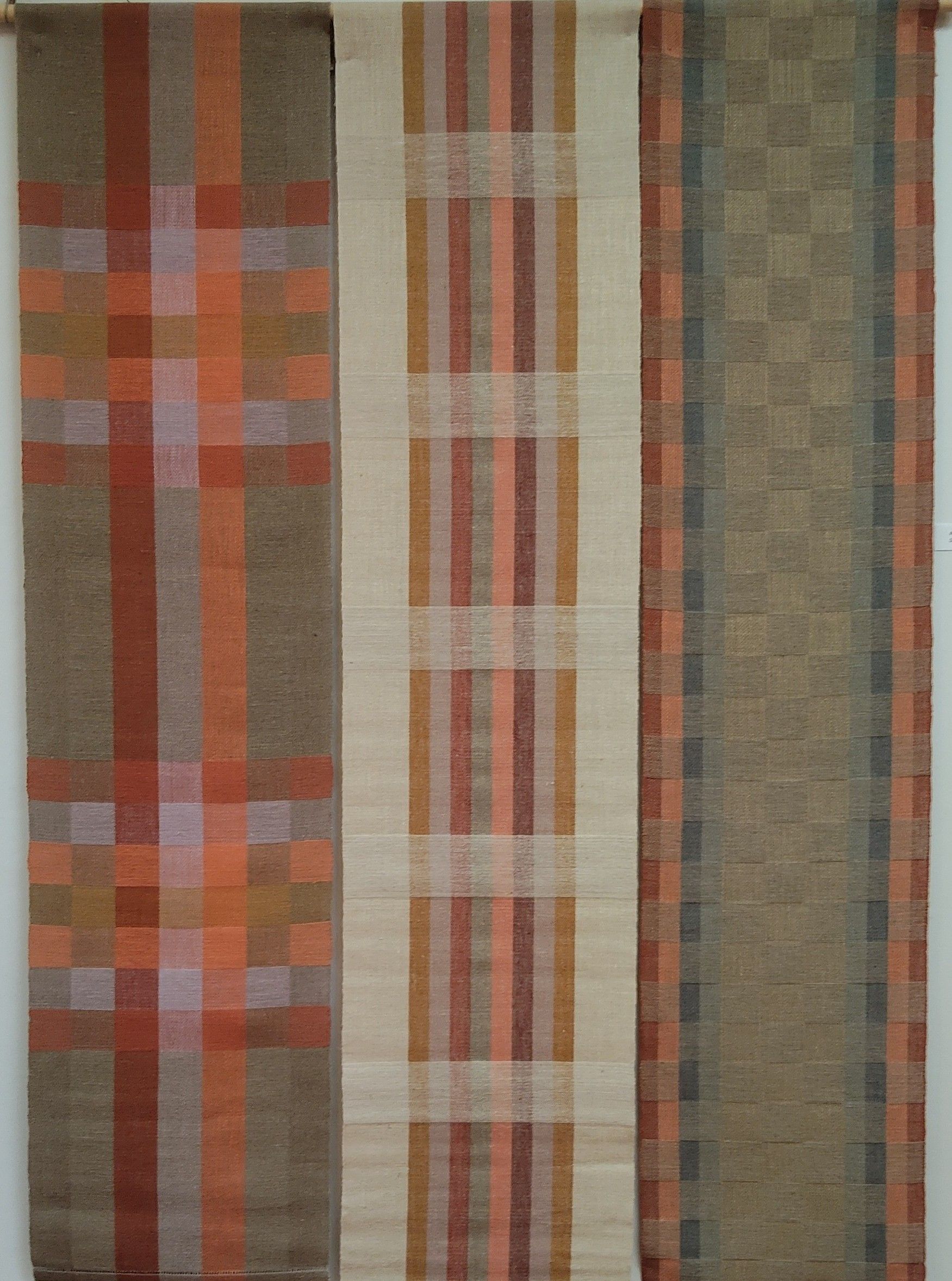 Tekstiilisuunnittelija Orvokki Leinon tekstiilitöitä ja käsinpainettuja kortteja 50 vuoden ajalta.